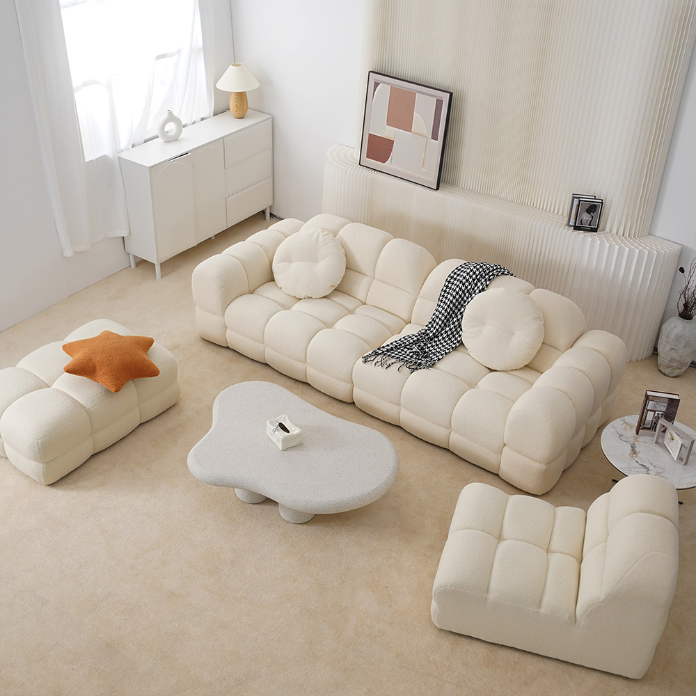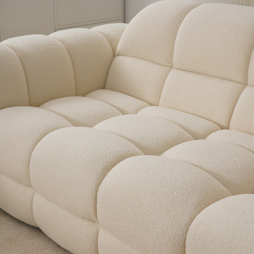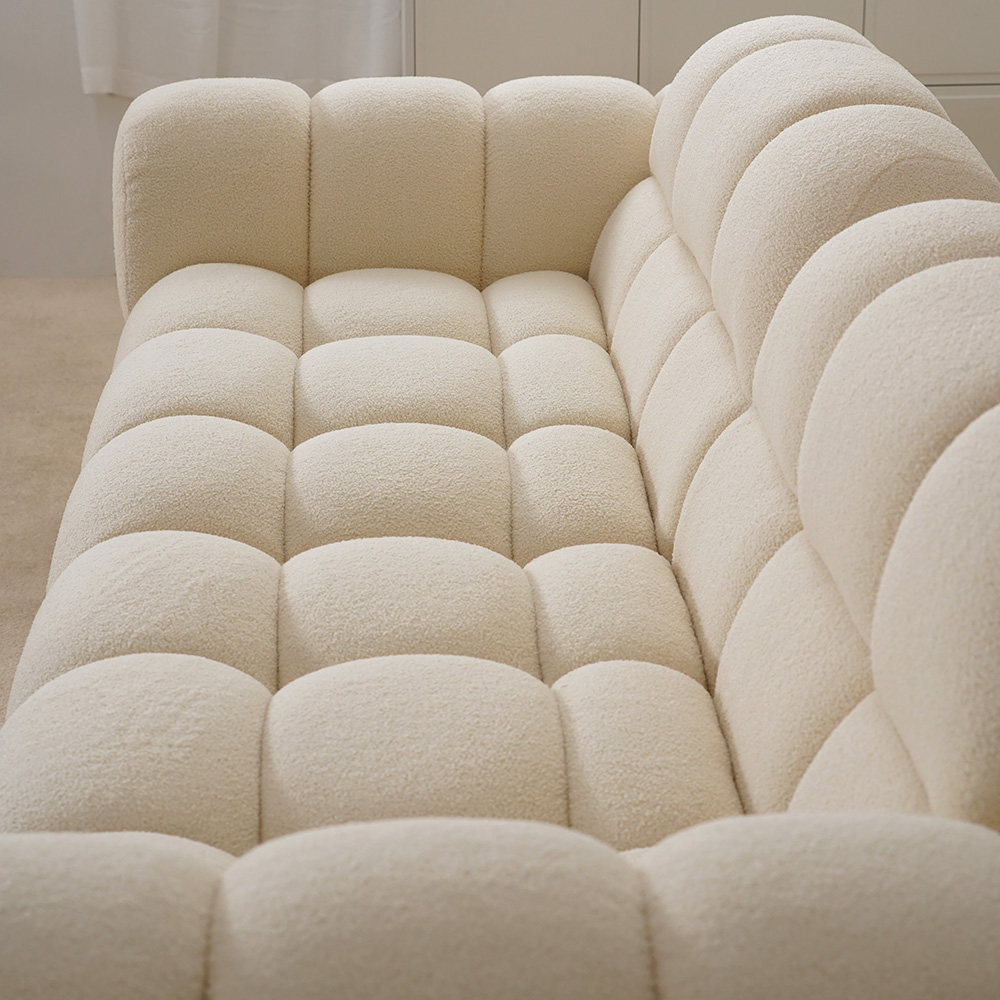 En iyi malzemeler kullanılarak titizlikle üretilen bu beyaz kanepe, zarafet ve dayanıklılığın örneğidir.Yemyeşil bir çayırı andıran markalı teddy kadife kumaşı, doğal güzelliğe bir dokunuş katıyor.Birinci sınıf karaçam ağacından yapılmış sağlam destek çerçevesi uzun süreli güvenilirlik sağlar.