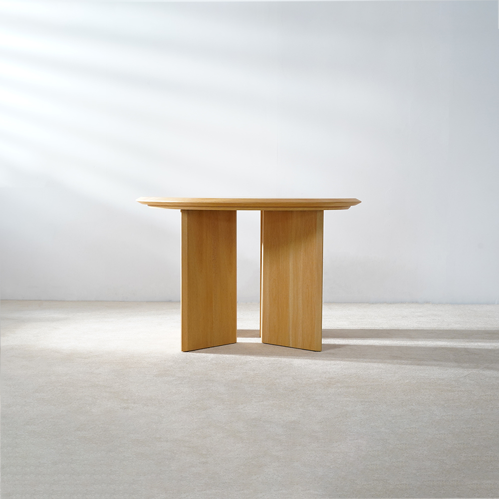 Bu modern yemek masası her iki tarafta dört adet kalınlaştırılmış masif ahşap blokla desteklenmektedir.Eksen merkezi değildir ve mekaniği ve geometrik estetiği entegre edecek şekilde tasarlanmıştır.